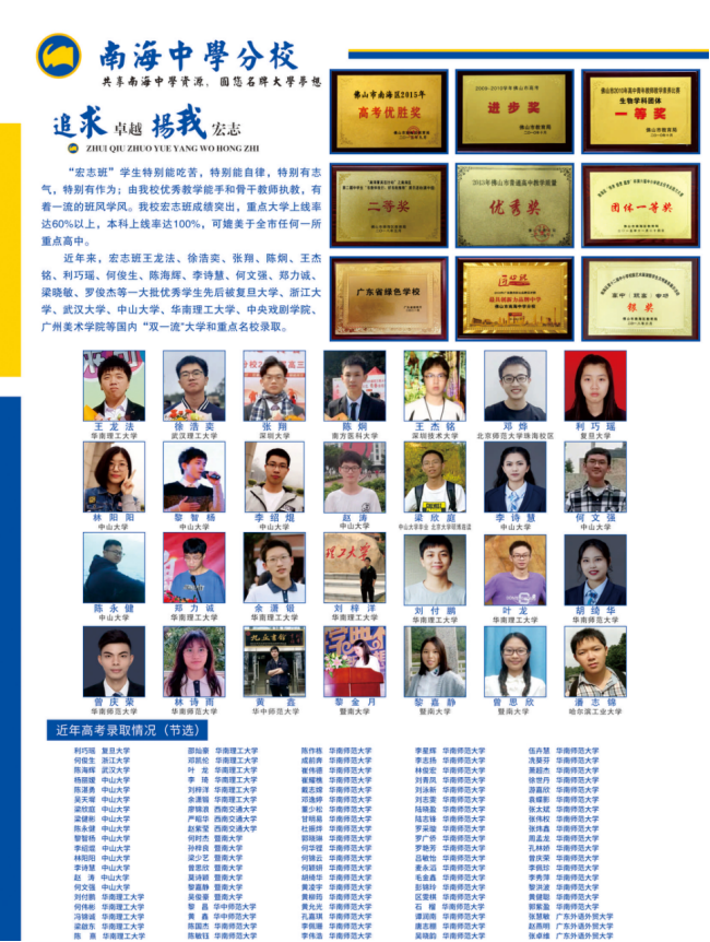 佛山市新优质高中;佛山市教学质量优秀奖;佛山市高考进步奖;佛山市高考优胜奖;南海区“五四红旗”团委等 |