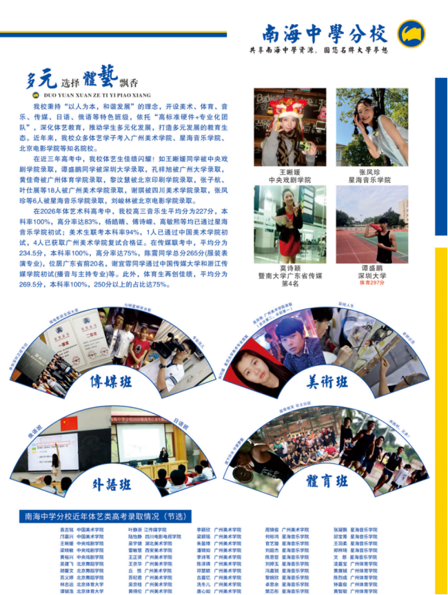(2) 学校坚持“五育并举”,秉持“以人为本,和谐发展”的教育理念,加强学生综合素质的培养,促进学生全面发展,取得了显著成绩。2024-2025学年度,南分学子各类竞赛及荣誉称号获奖达275人次!冯卓颖同学荣获2025年度广东省宋庆龄奖学金,吴美贤同学荣获“佛山市优秀学生”称号,黄广汕同学荣获“佛山市优秀学生干部”称号,黎易乘等27人获得“南海区优秀学生”称号,林文轩等7人获得“南海区优秀学生干部”。黄文轩、金攸阳同学荣获南海区第十五届“梦翔杯”中小学生个人才艺大赛一等奖,健美操队在2025年广东省健美操锦标赛中斩获一冠一亚的好成绩。2025年南海区“科日杯”高中足球联赛,荣获高中女子组第八名。
